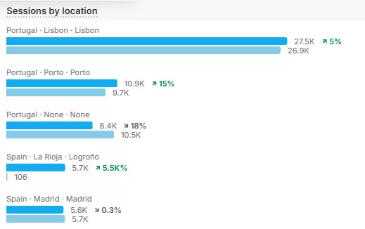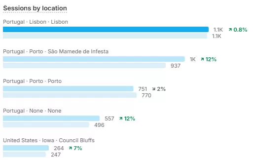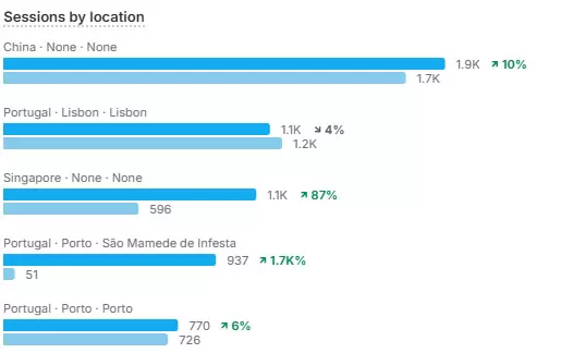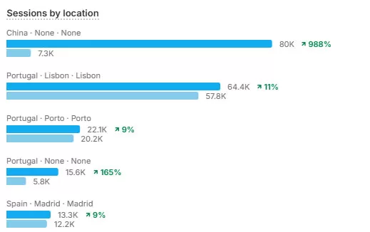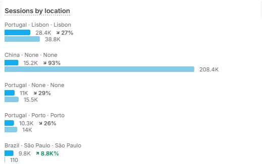 Na prática, uma das formas mais úteis de identificar tráfego problemático continua a ser a sua origem geográfica. Em muitos casos, os picos anómalos surgem de regiões onde o tráfego é mais barato ou onde existe forte concentração de actividade automatizada, como China, Bangladesh ou Paquistão. Quando uma marca sem operação real nesses mercados começa a receber volumes desproporcionais dessas localizações, há uma forte probabilidade de estar perante tráfego não-humano ou tecnicamente irrelevante para o negócio.
