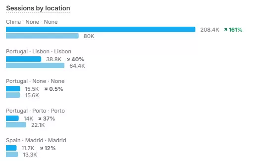 Na BYDAS tivemos um caso particularmente expressivo numa marca bastante conhecida. Em dezembro de 2025, a loja começou a ser bombardeada por tráfego com origem na China. O volume foi tão intenso que chegou à ordem das 80 mil sessões, com impacto direto nas leituras de performance.