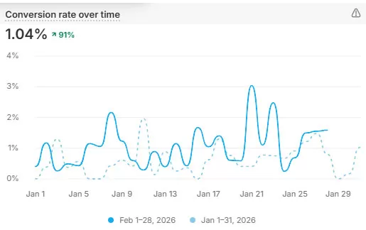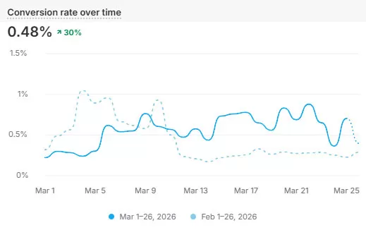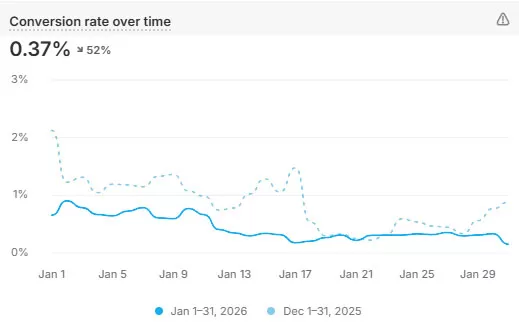 Em março de 2026 chegou a prova que interessava. Depois de dizimarmos praticamente todo o tráfego de localizações suspeitas, a taxa de conversão da loja subiu 30%. Isto não significou que a loja tivesse subitamente ficado “melhor” do ponto de vista comercial de um dia para o outro. Significou, sobretudo, que a leitura voltou a aproximar-se da realidade humana da operação. Em vez de ruído técnico a esmagar o desempenho aparente, a marca passou novamente a ver números utilizáveis para decidir.